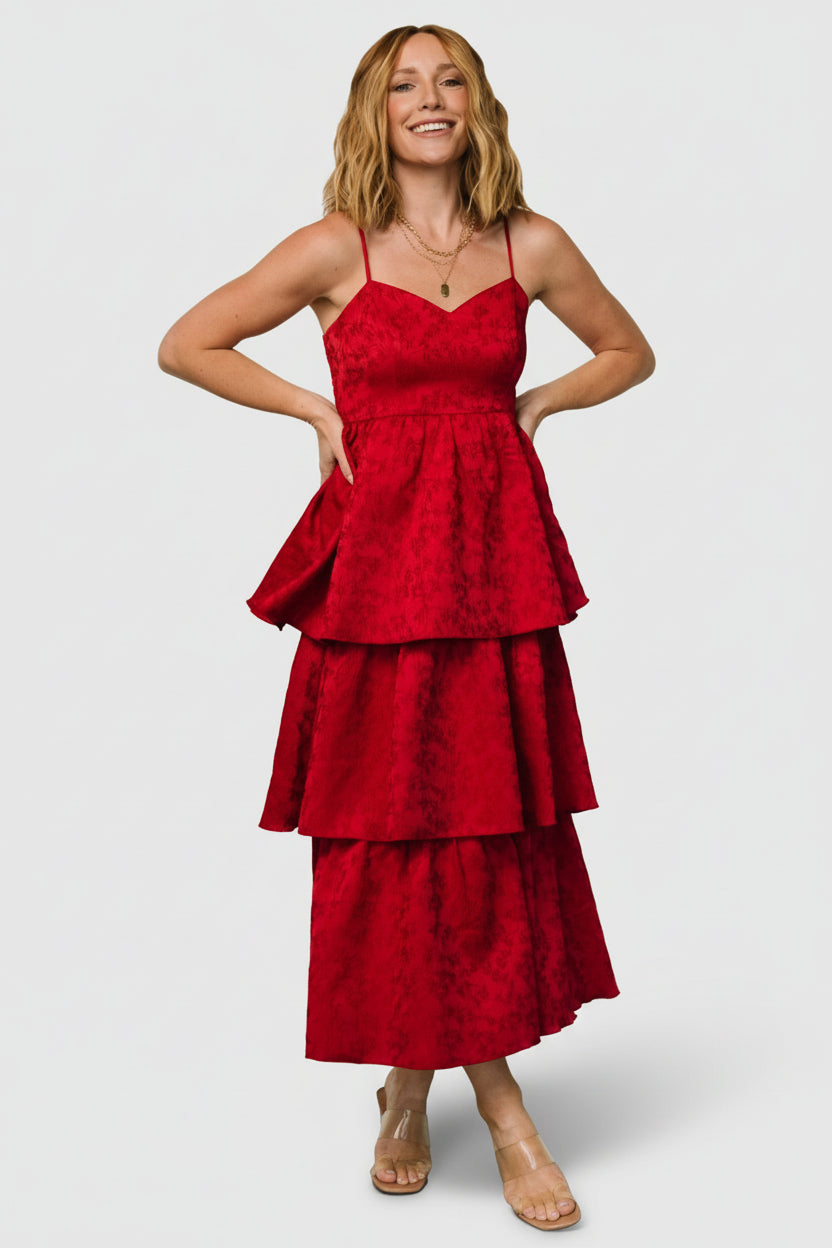 Violetta Embossed Tiered Dress | Deep Red