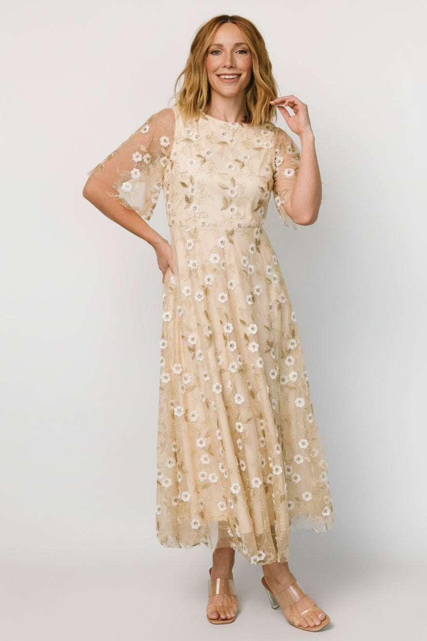 Arabella Embroidered Tulle Maxi Dress | Gold + White