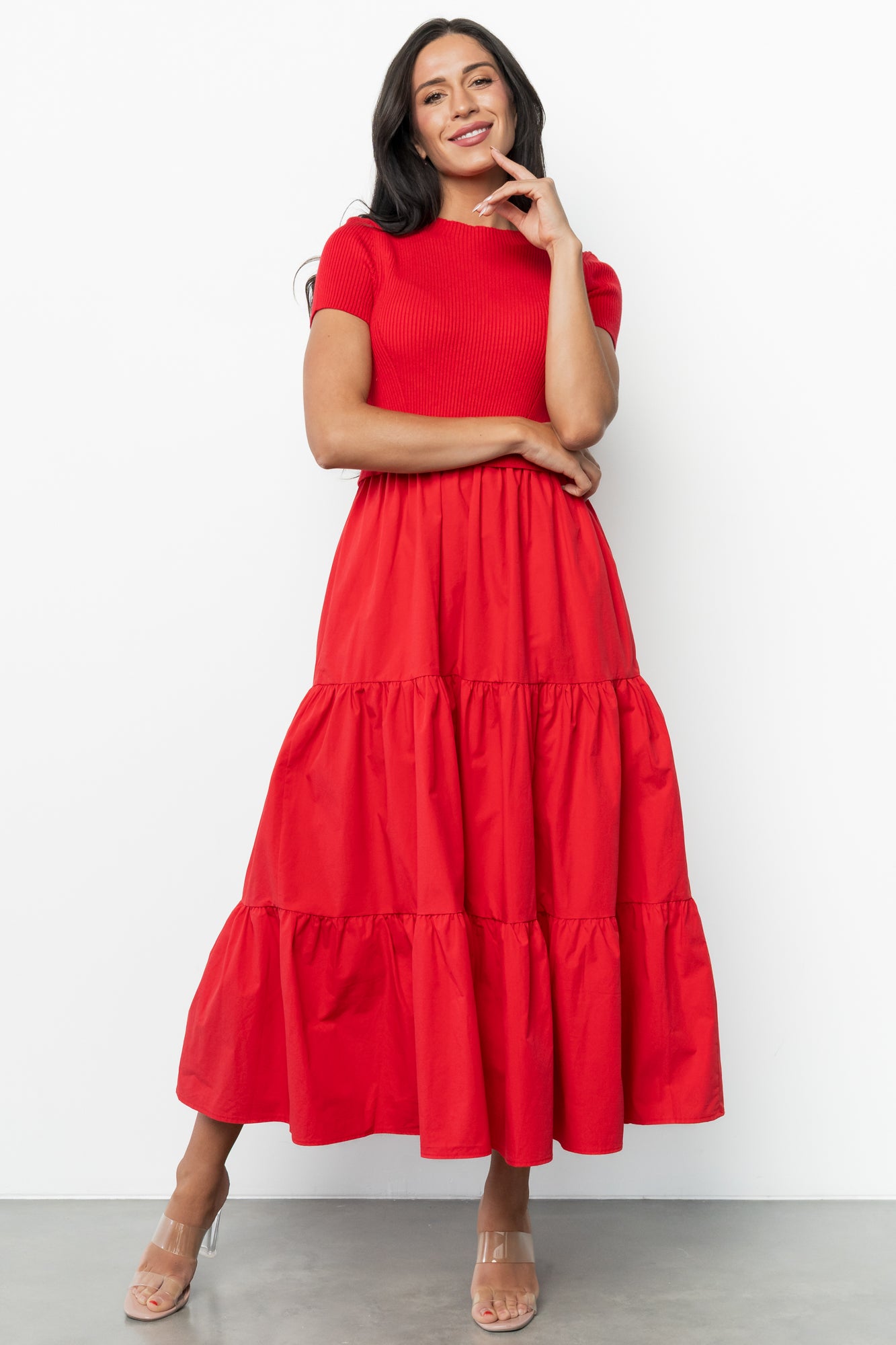 - Sweater knit material at bodice with a structured skirt