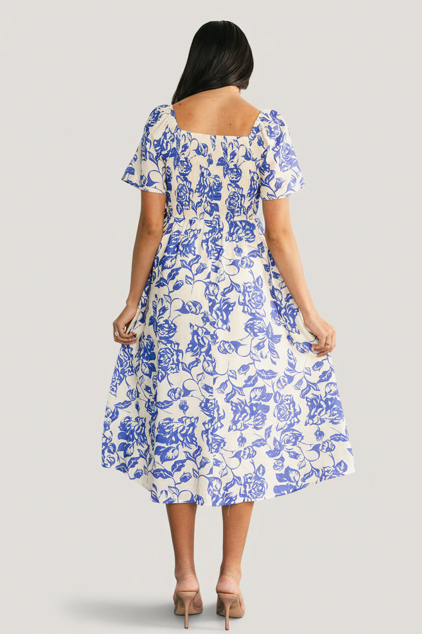 - Smocked bodice has stretch