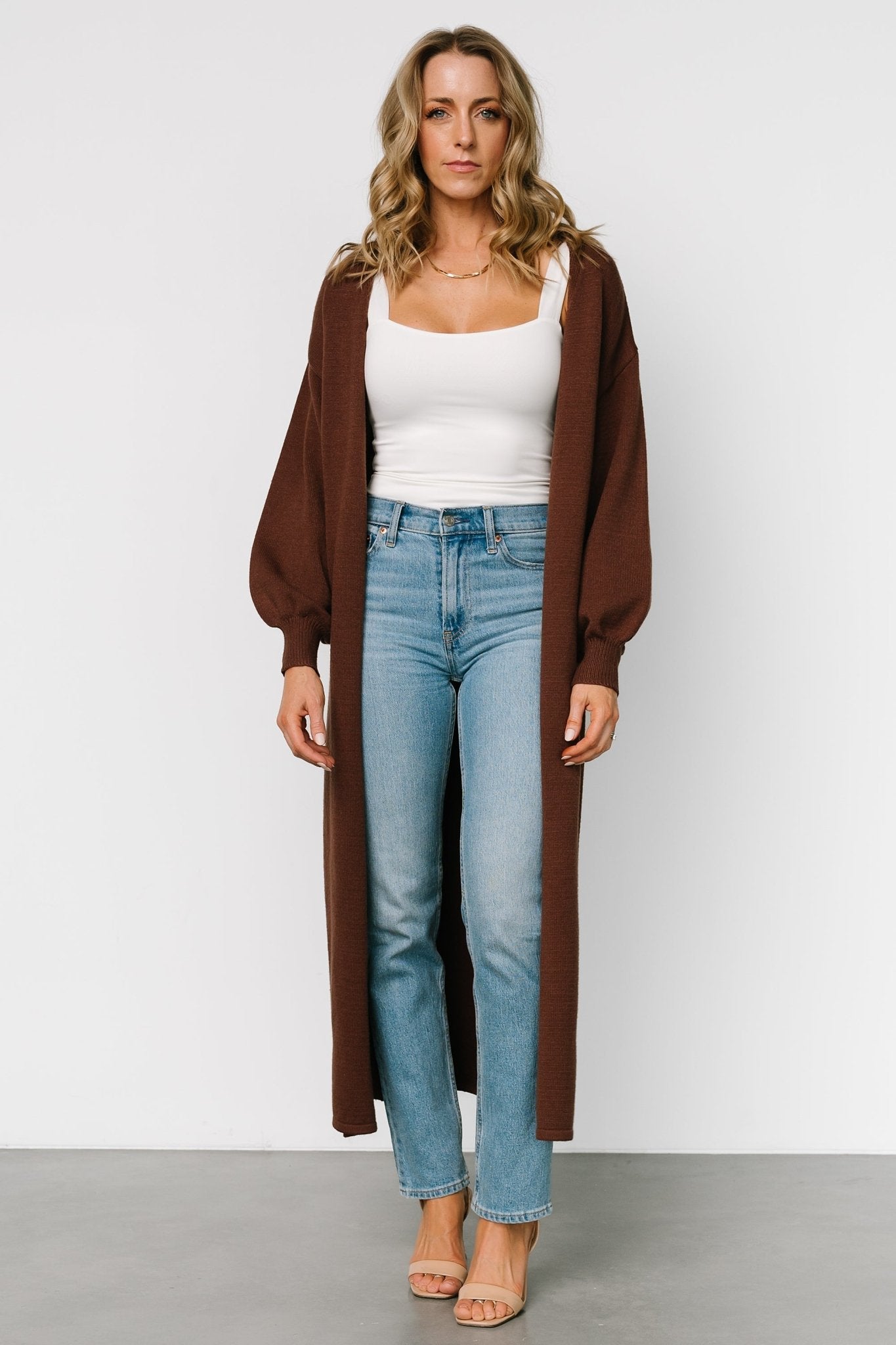 - This long open cardigan is perfect for layering and takes any outfit to the next level. Wear with a dress or your favorite top and jeans!