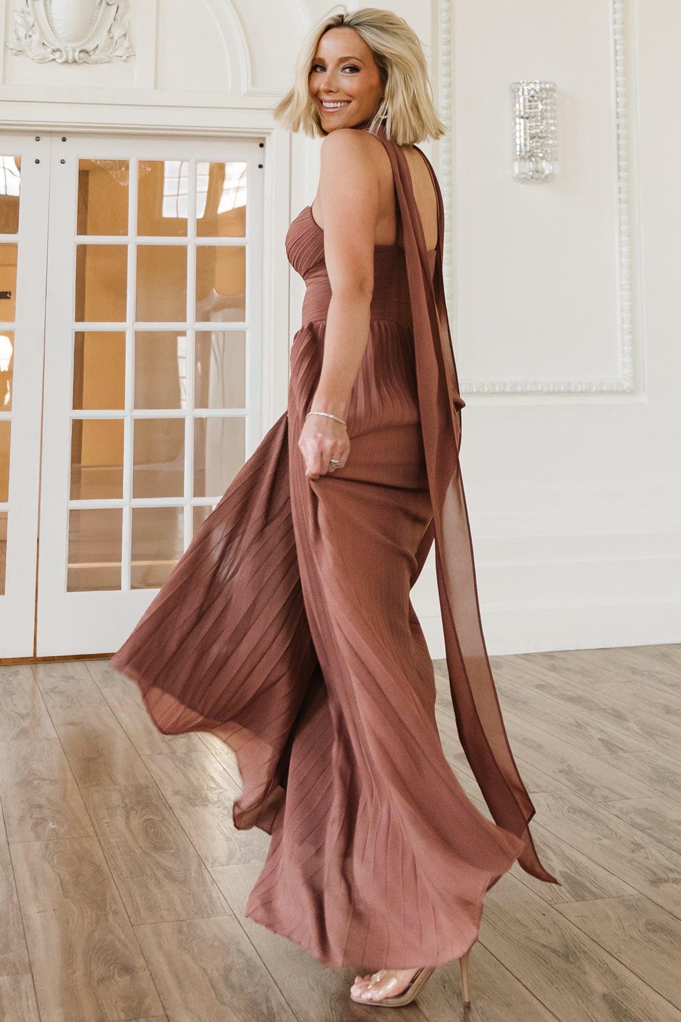 - Structured pleated bodice with faux diagonal wrap